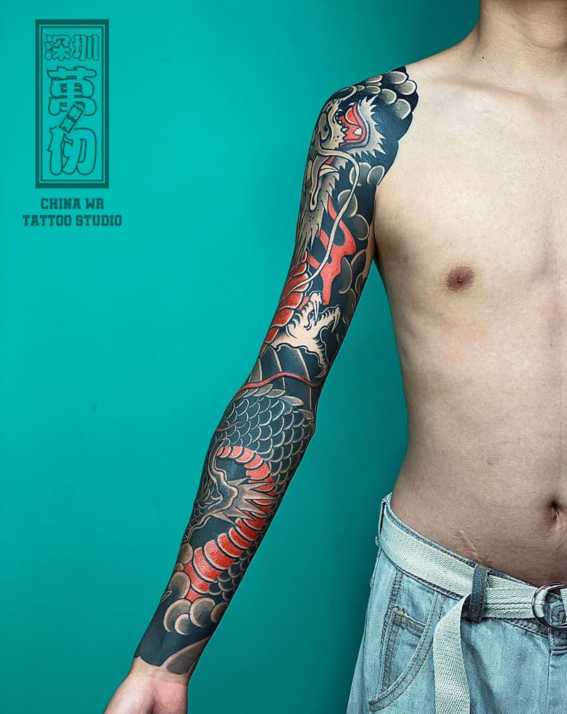 当前位置: 首页 >广东省深圳市纹身店-万仞刺青纹身图案>传统花臂 红龙纹身图片_手臂老传统纹身图案