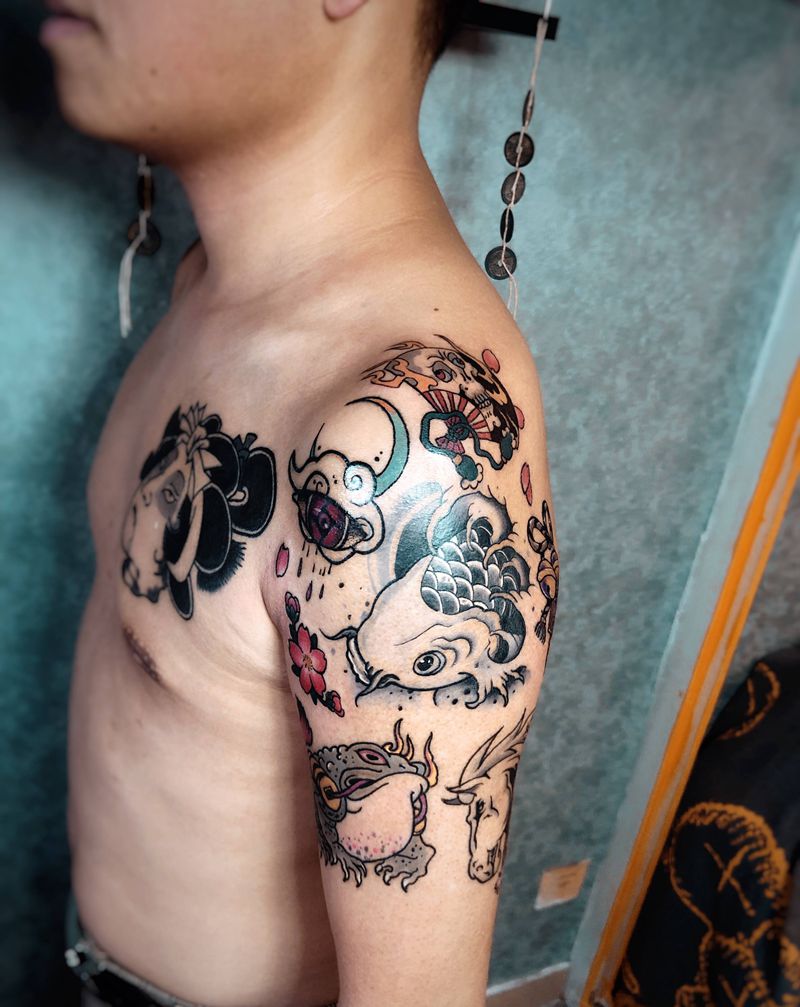 当前位置: 首页 >广东省深圳市纹身店-峰刺青纹身工作室纹身图案>小图拼接纹身图片_手臂新传统Old School纹身图案