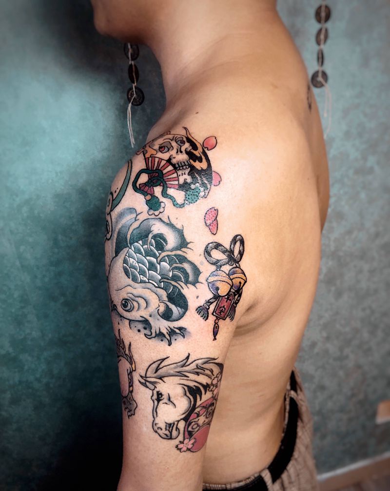 当前位置: 首页 >广东省深圳市纹身店-峰刺青纹身工作室纹身图案>小图拼接纹身图片_手臂新传统Old School纹身图案