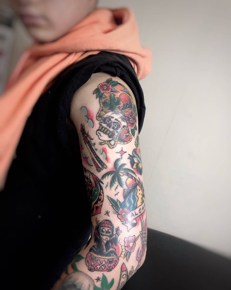 当前位置: 首页 >广东省深圳市纹身店-峰刺青纹身工作室纹身图案>拼接花臂纹身图片_手臂Old School纹身图案