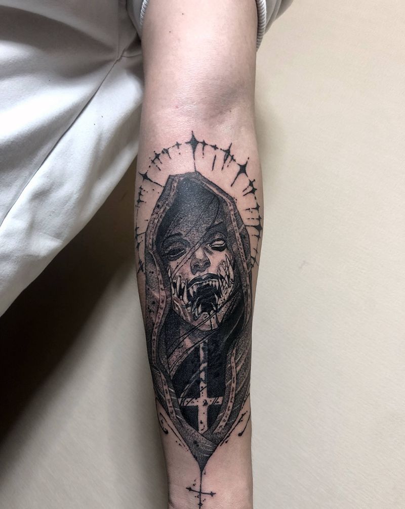 当前位置: 首页 >广东省深圳市纹身店-峰刺青纹身工作室纹身图案>暗黑遮盖纹身图片_手臂新传统点刺纹身图案