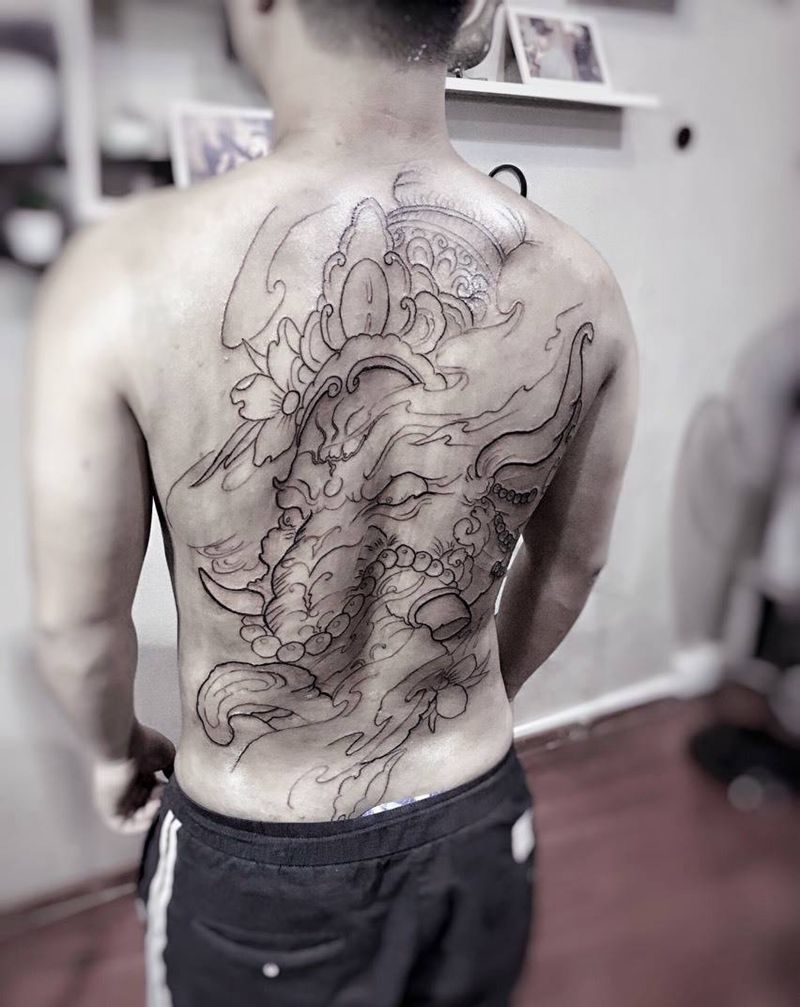 当前位置: 首页 >广东省深圳市纹身店-峰刺青纹身工作室纹身图案>象神满背勾线纹身图片