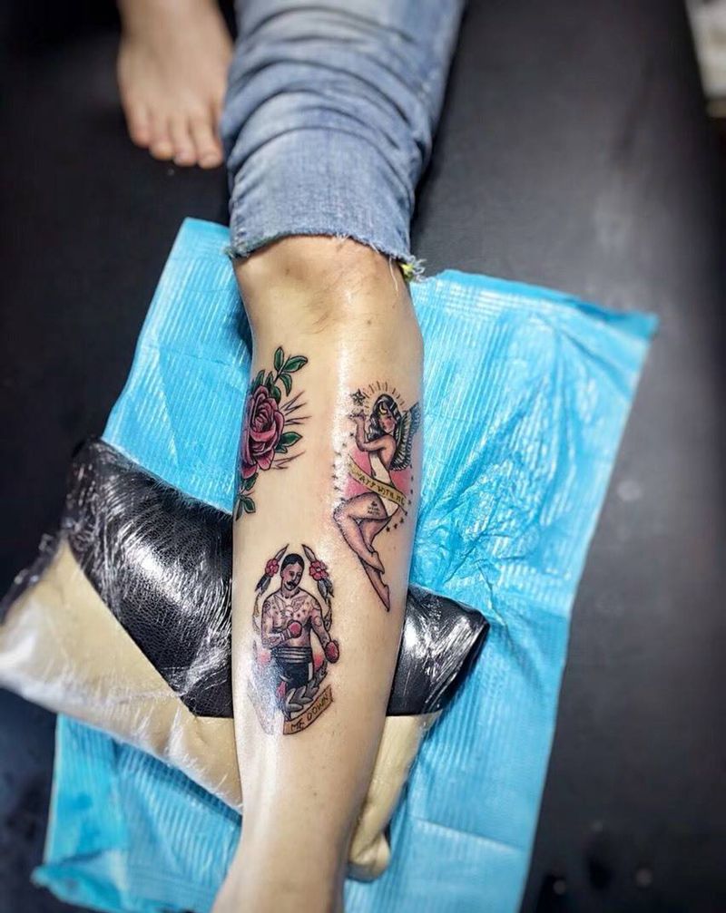• T包小腿吹火男+阿多福纹身图片_腿部老传统新传统吹火男阿