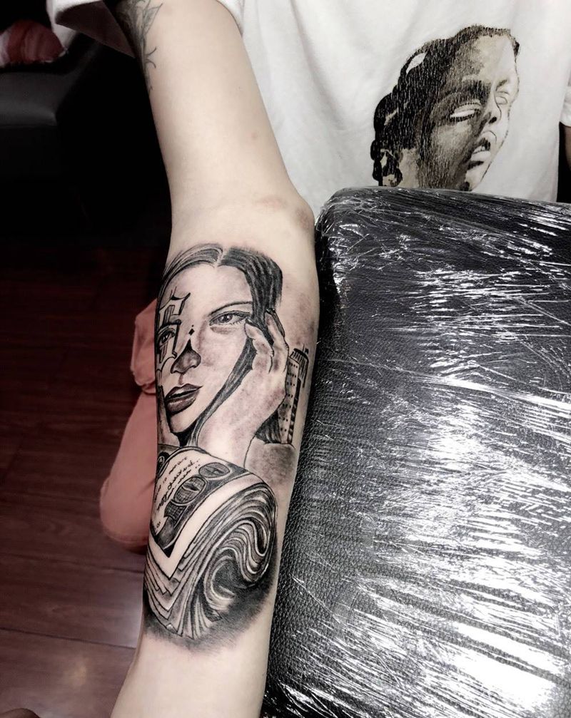 当前位置: 首页 >广东省深圳市纹身店-峰刺青纹身工作室纹身图案>其卡诺女郎纹身图片_手臂欧美写实花体字纹身图案