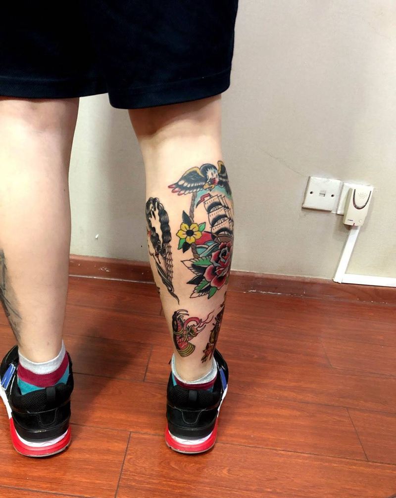 • T包小腿吹火男+阿多福纹身图片_腿部老传统新传统吹火男阿
