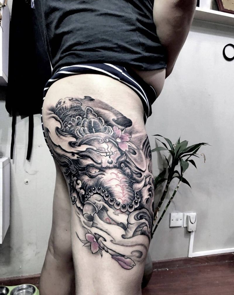 • T网红王老大花腿龙纹身图片_腿部新传统纹身图案