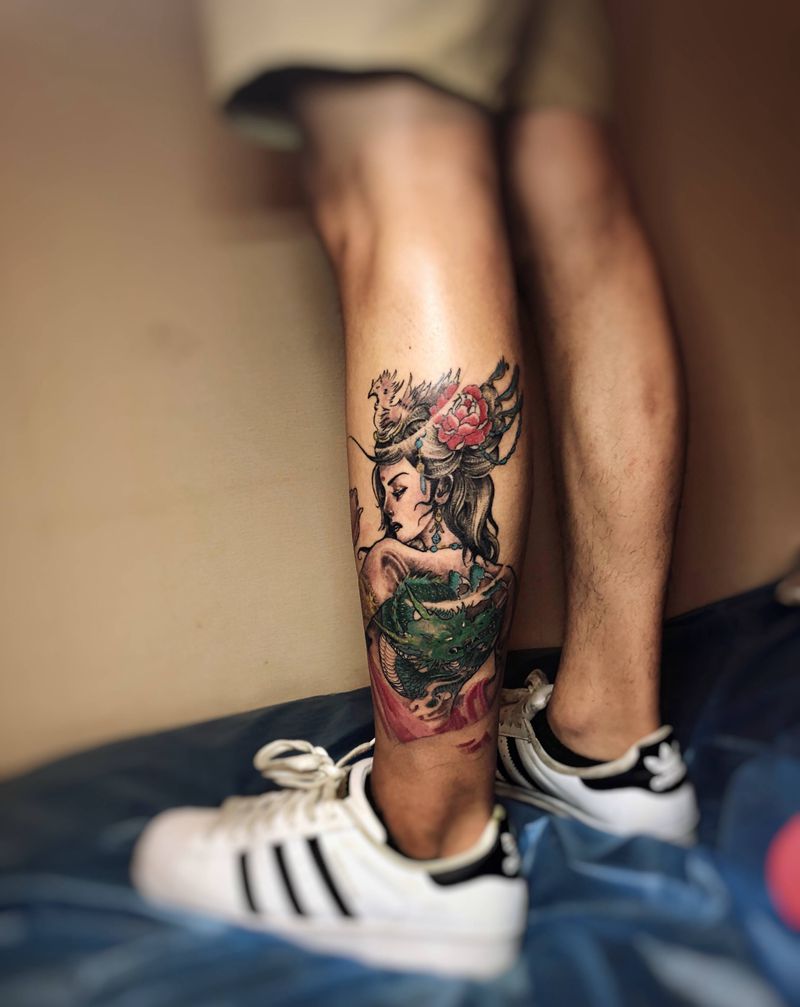 • T网红王老大花腿龙纹身图片_腿部新传统纹身图案