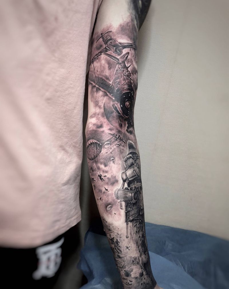 战争花臂 未完纹身图片_手臂欧美写实反战战场纹身图案