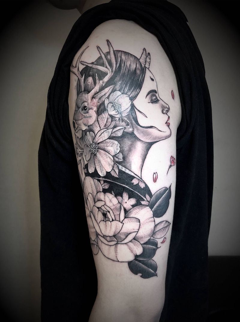 当前位置: 首页 >广东省深圳市纹身店-峰刺青纹身工作室纹身图案>艺妓 遮盖图纹身图片_肩部手臂新传统点刺纹身图案