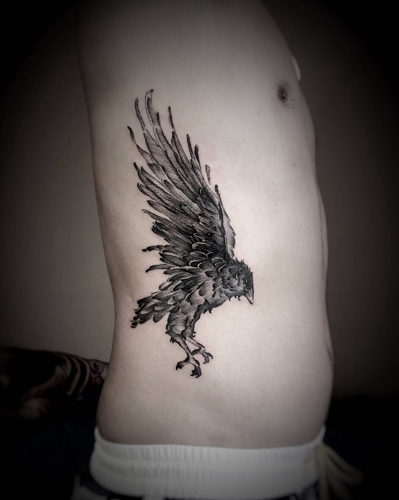 当前位置: 首页 >广东省深圳市纹身店-峰刺青纹身工作室纹身图案>乌鸦纹身图片_腹部腰部点刺欧美写实纹身图案