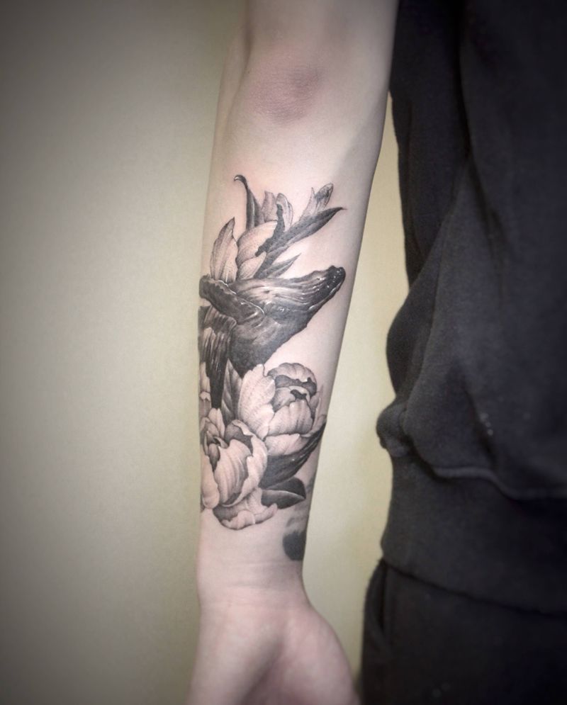 鲸鱼纹身图片_手部手臂点刺欧美写实素花纹身图案