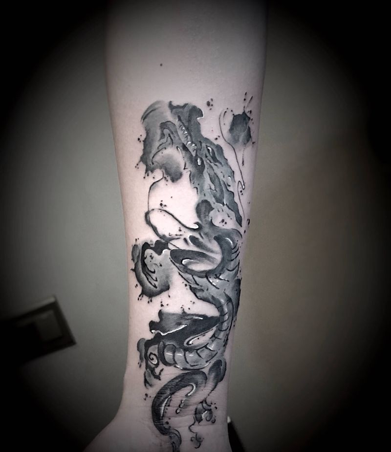 当前位置: 首页 >广东省深圳市纹身店-峰刺青纹身工作室纹身图案>中国风纹身图片_手臂手部新传统水墨太极龙纹身图案