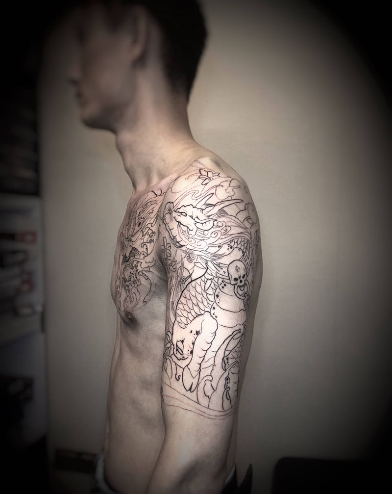 当前位置: 首页 >广东省深圳市纹身店-峰刺青纹身工作室纹身图案>半甲勾线纹身图片_肩部手臂新传统纹身图案