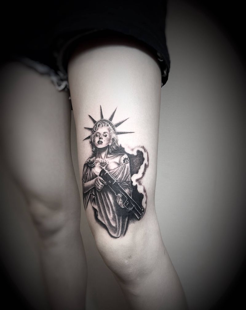 这是一个遮盖纹身图片_腿部欧美写实新传统西海岸纹身图案