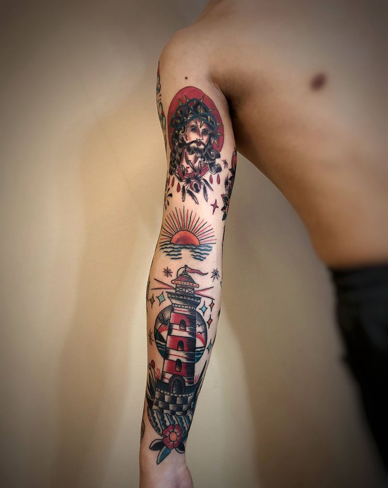 当前位置: 首页 >广东省深圳市纹身店-峰刺青纹身工作室纹身图案>拼接花臂纹身图片_手臂Old School纹身图案