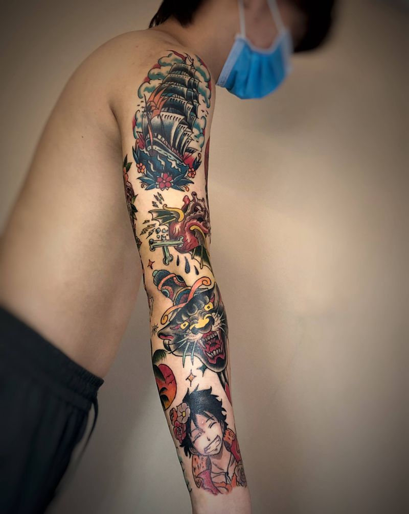当前位置: 首页 >广东省深圳市纹身店-峰刺青纹身工作室纹身图案>拼接花臂纹身图片_手臂手部Old School新传统纹身图案