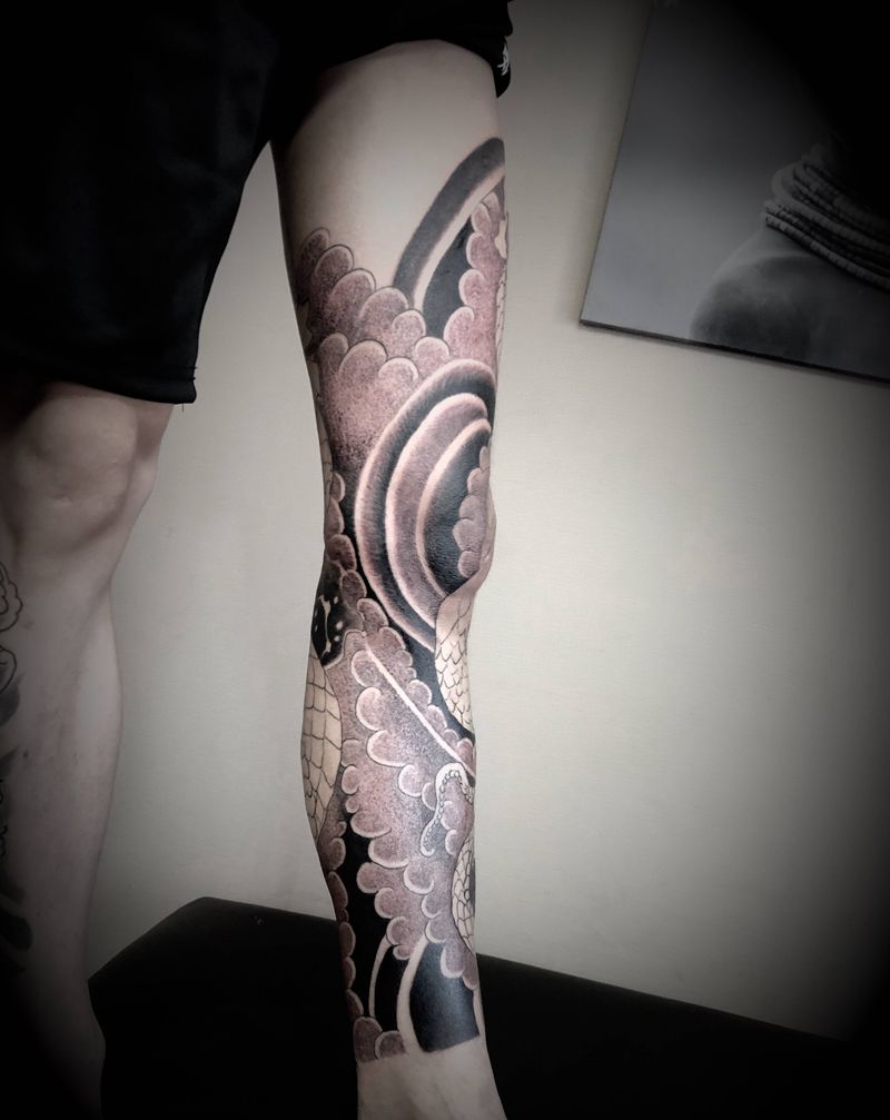 • T网红王老大花腿龙纹身图片_腿部新传统纹身图案