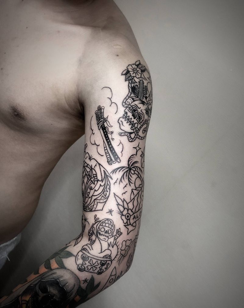 当前位置: 首页 >广东省深圳市纹身店-峰刺青纹身工作室纹身图案>拼接花臂 未完纹身图片_Old School纹身图案