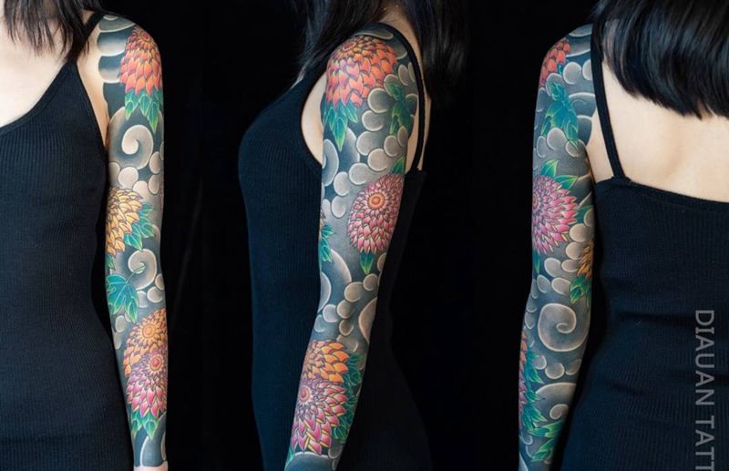 当前位置: 首页 >广东省深圳市纹身店-彫安刺青纹身图案>日式老传统菊花花臂纹身图片
