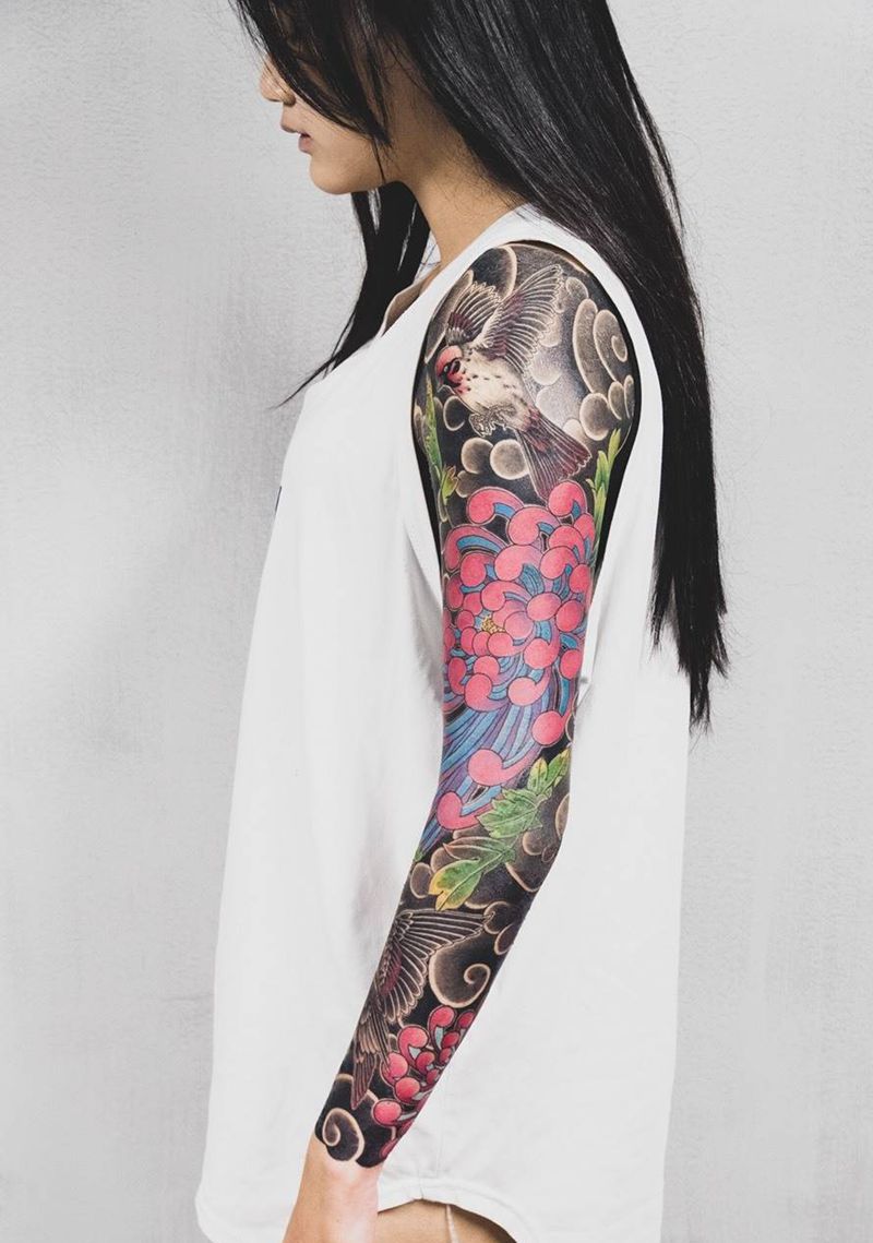 当前位置: 首页 >广东省深圳市纹身店-深圳彫安刺青纹身图案>喜雀 菊花 傳統纹身图片_手臂老传统纹身图案