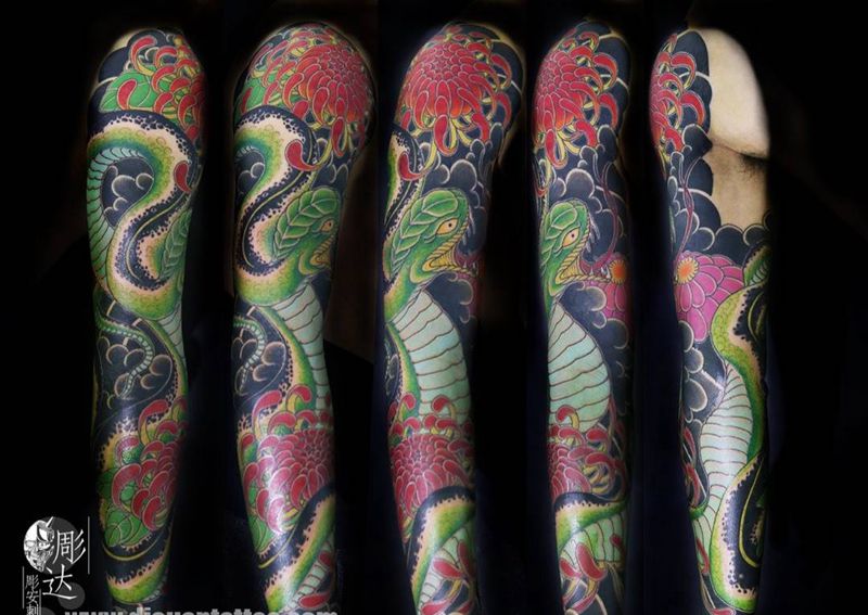 当前位置: 首页 >广东省深圳市纹身店-深圳彫安刺青纹身图案>蛇 菊 傳統花臂纹身图片