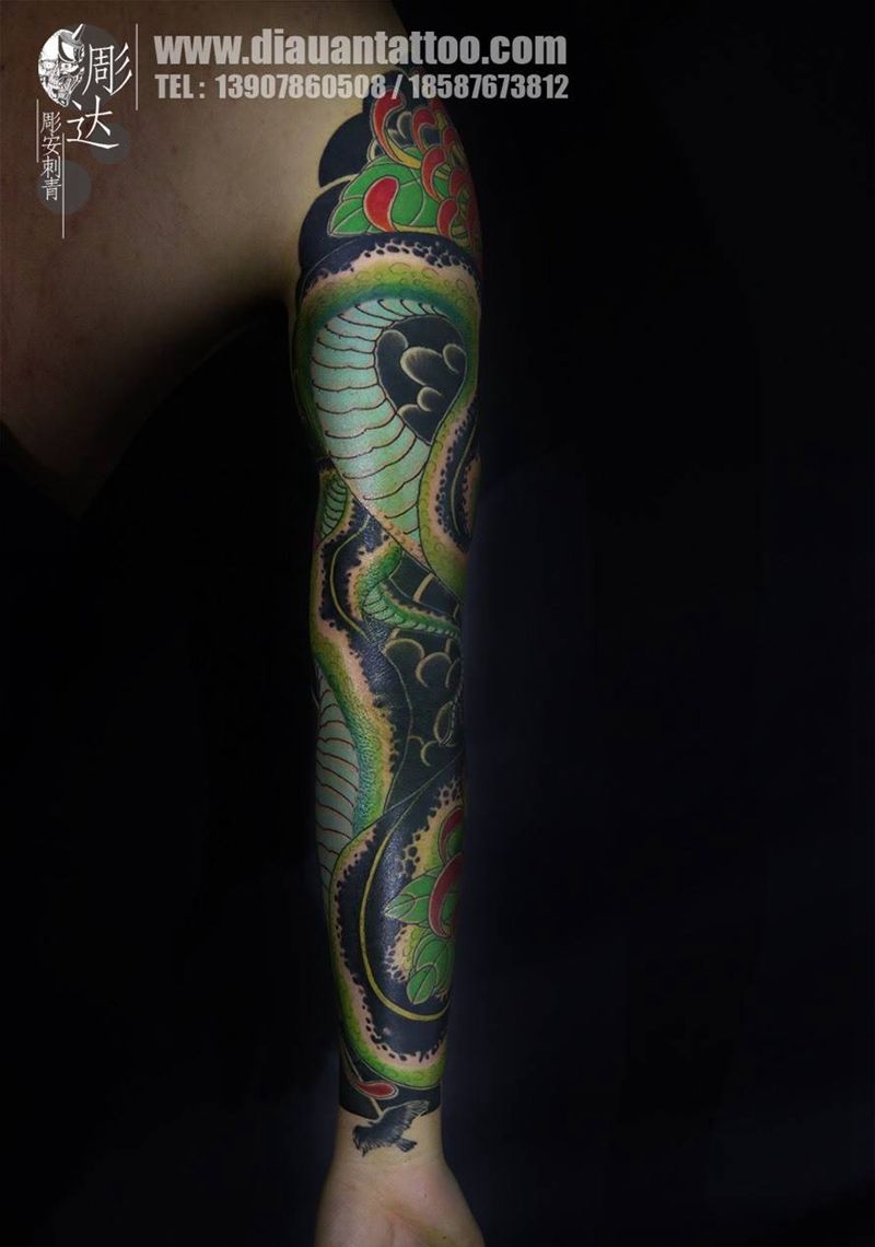 当前位置: 首页 >广东省深圳市纹身店-深圳彫安刺青纹身图案>蛇 菊 傳統花臂纹身图片