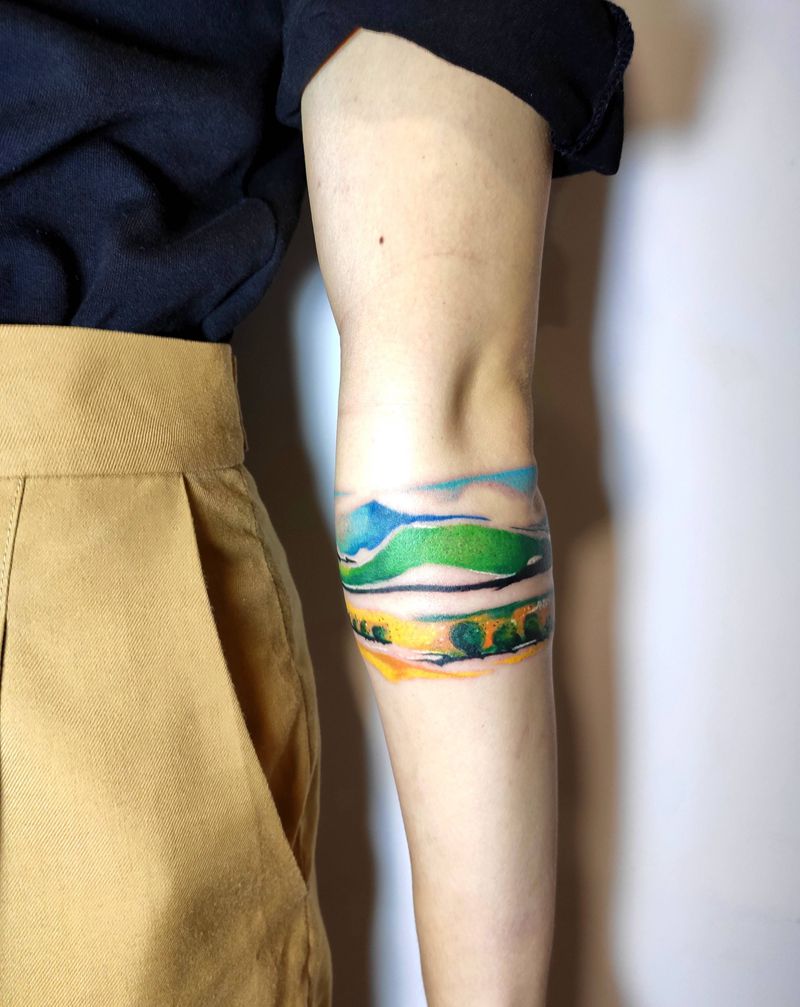 油画风景纹身图片_手臂水彩纹身图案