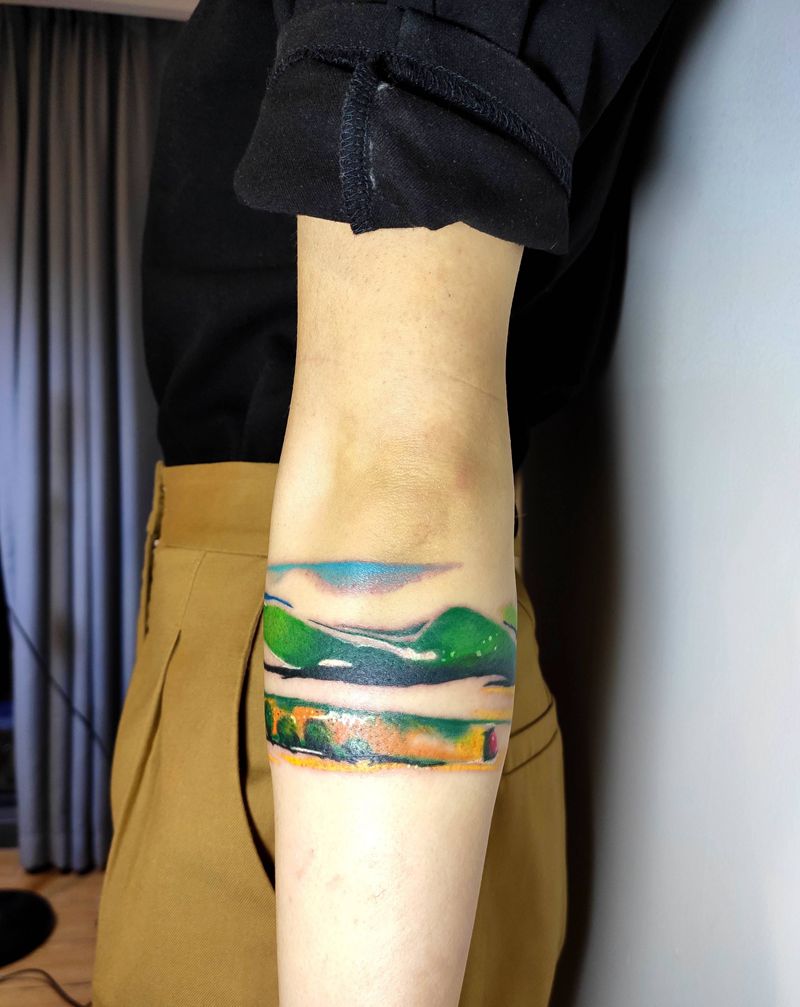 油画风景纹身图片_手臂水彩纹身图案