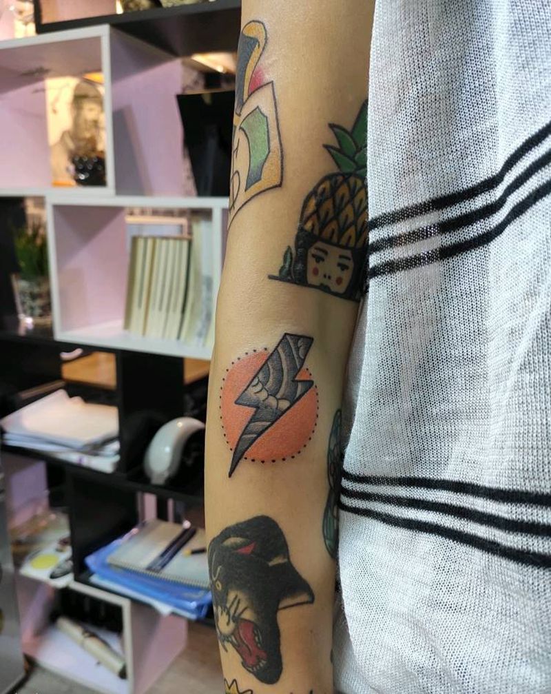 当前位置: 首页 >广东省深圳市纹身店-三日刺青艺术工作室纹身图案>拼接继续纹身图片_手臂Old School纹身图案