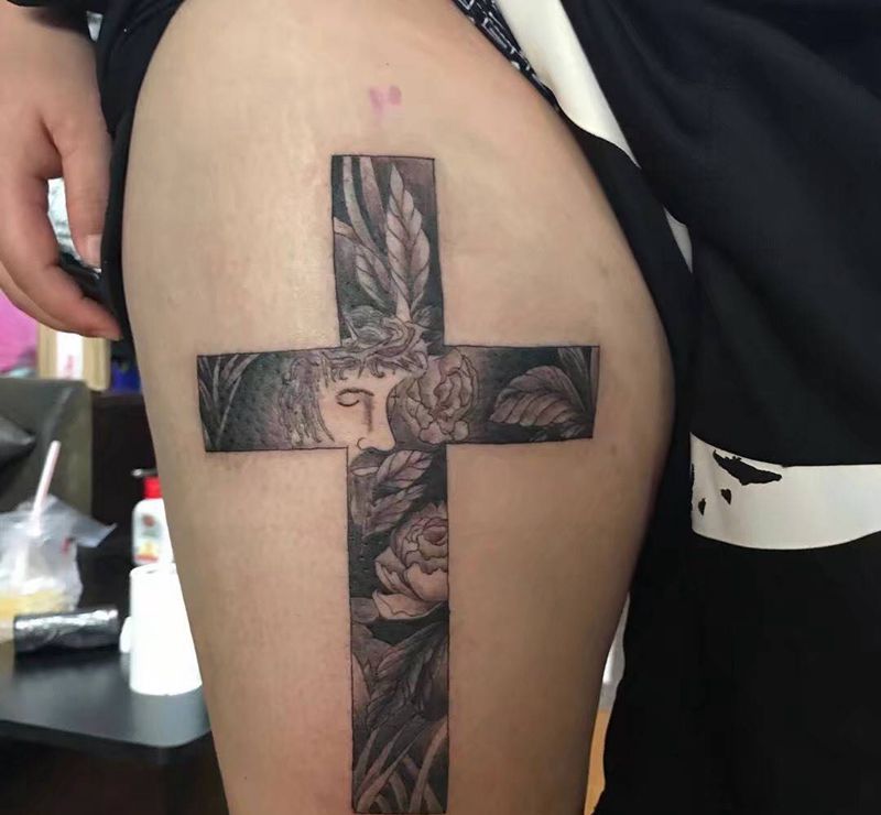 十字架耶稣纹身图片_腿部欧美写实纹身图案
