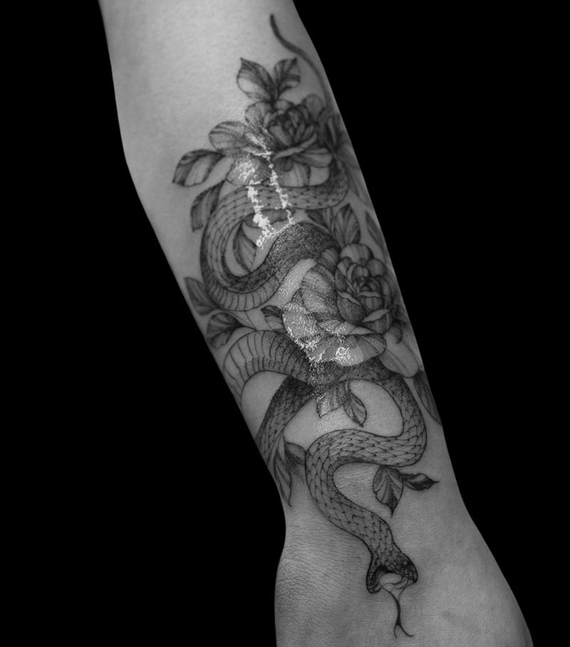 花与蛇纹身图片_手臂欧美写实蛇花花与蛇纹身图案