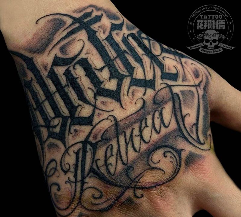 当前位置: 首页 >广东省深圳市纹身店-花邦刺青馆纹身图案>花体字纹身图片_手部花体字花体字手背纹身图案