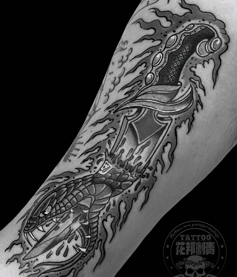 当前位置: 首页 >广东省深圳市纹身店-花邦刺青馆纹身图案>蛇匕首纹身图片_手臂New School蛇匕首纹身图案