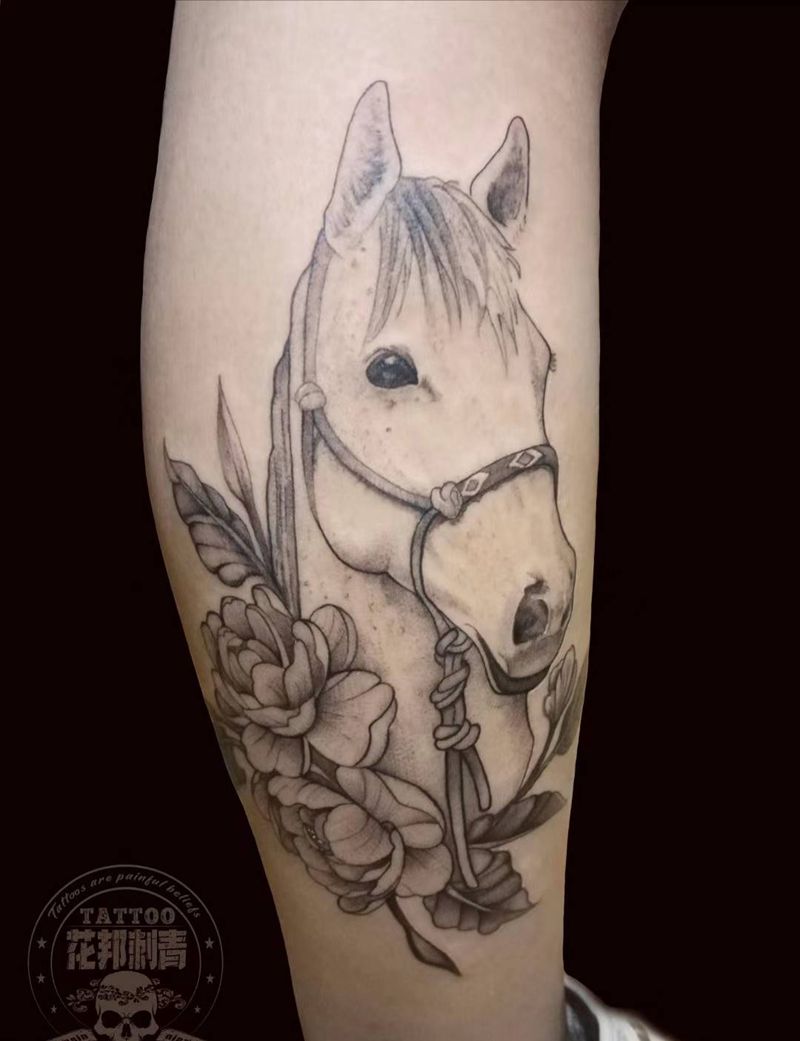 素花白马纹身图片_腿部欧美写实素花马纹身图案