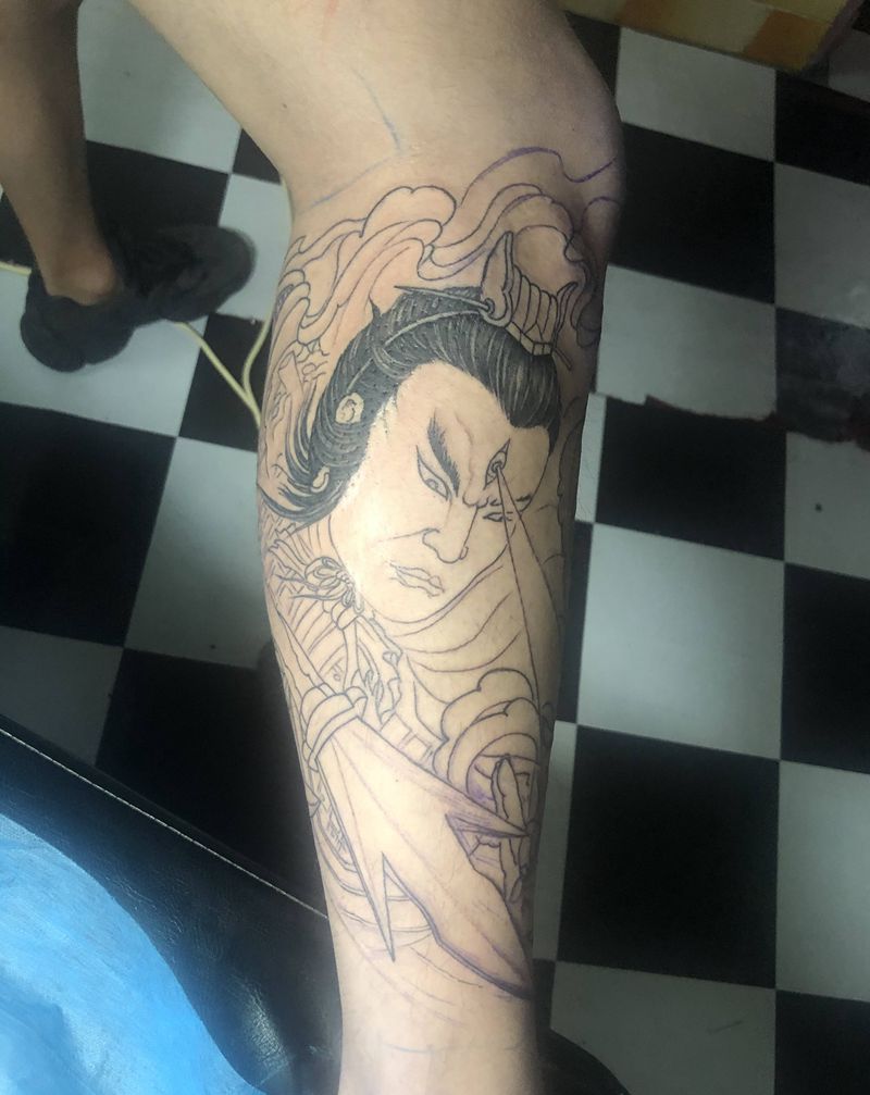 当前位置: 首页 >广东省深圳市纹身店-加王刺青纹身图案>花腿半成品纹身图片_腿部老传统人物纹身图案