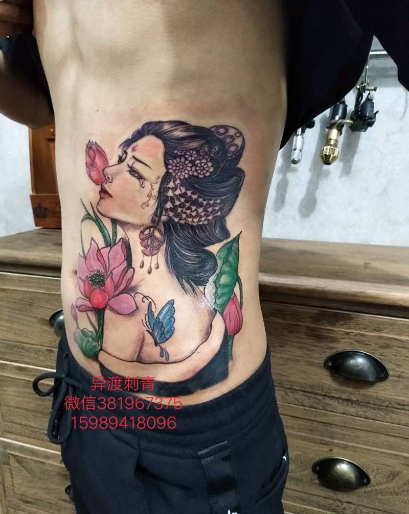 腰部艺伎纹身图片_腰部人物成品纹身图案