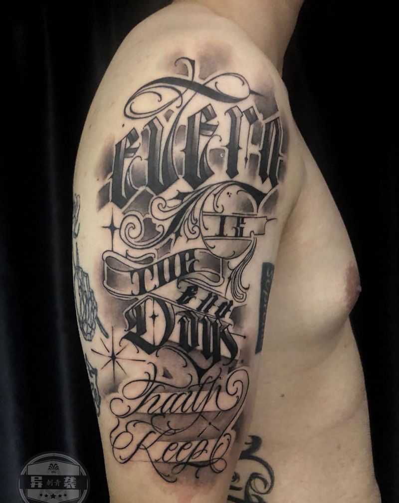 当前位置: 首页 >广东省深圳市纹身店-异袭Tattoo刺青馆纹身图案>原创花体字 软硬结合纹身图片_手臂花体字纹身图案