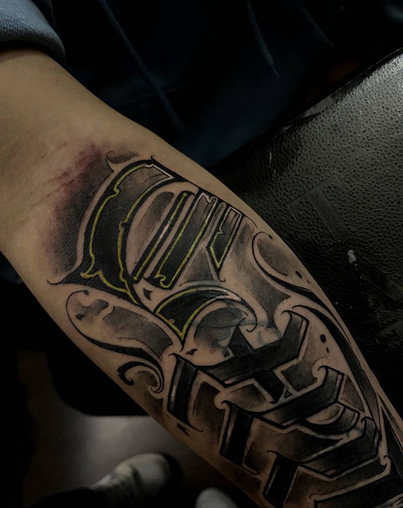 当前位置: 首页 >广东省深圳市纹身店-异袭Tattoo刺青馆纹身图案>原创哥特花体字纹身图片_手臂花体字纹身图案