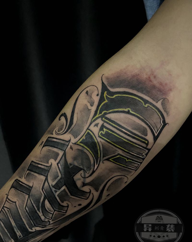 当前位置: 首页 >广东省深圳市纹身店-异袭Tattoo刺青馆纹身图案>原创哥特花体字纹身图片_手臂花体字纹身图案