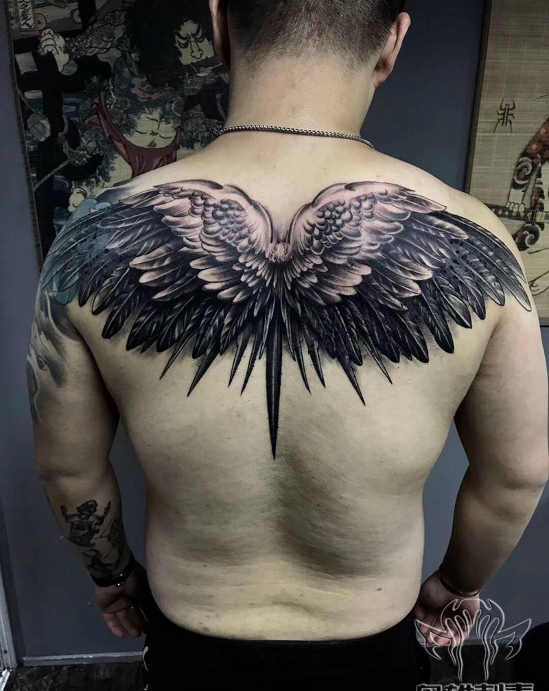 当前位置: 首页 >广东省珠海市纹身店-珠海枭雄纹身馆纹身图案>翅膀纹身图片_肩部背部新传统欧美写实天使翅膀羽毛纹身图案