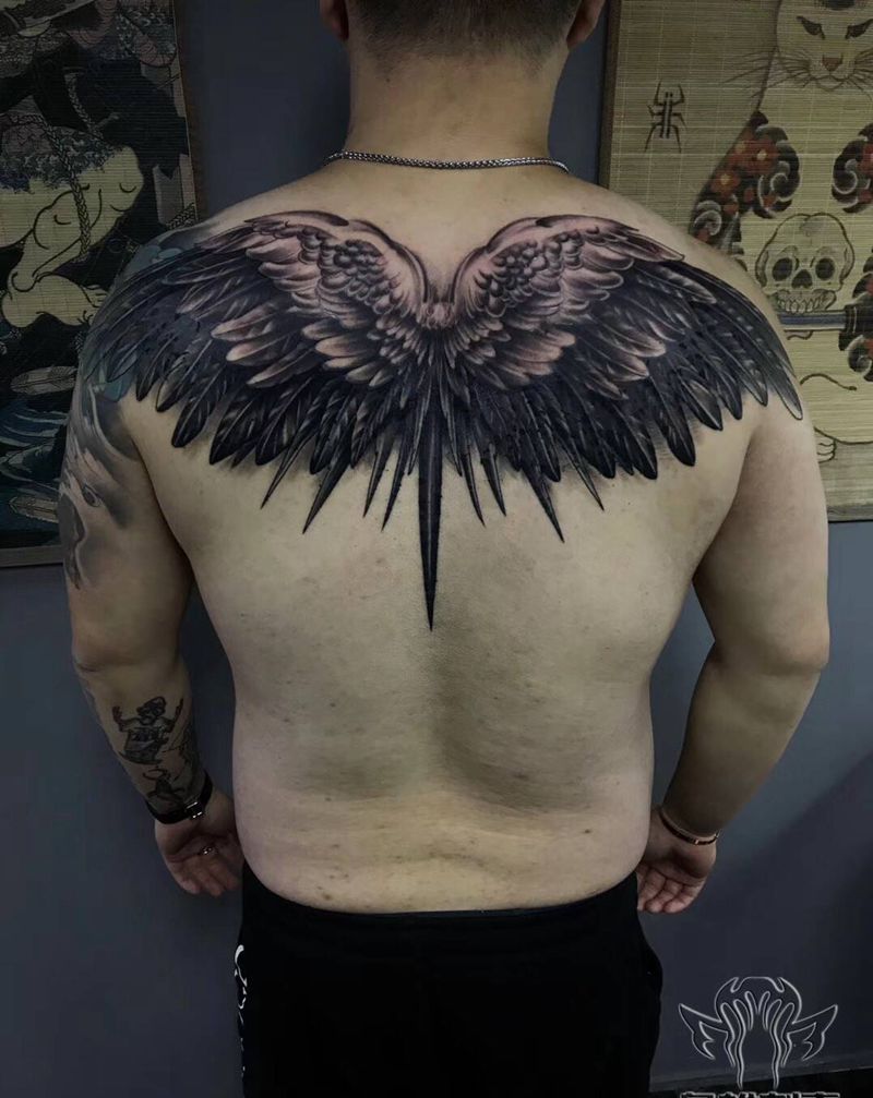 当前位置: 首页 >广东省珠海市纹身店-珠海枭雄纹身馆纹身图案>翅膀纹身图片_肩部背部新传统欧美写实天使翅膀羽毛纹身图案