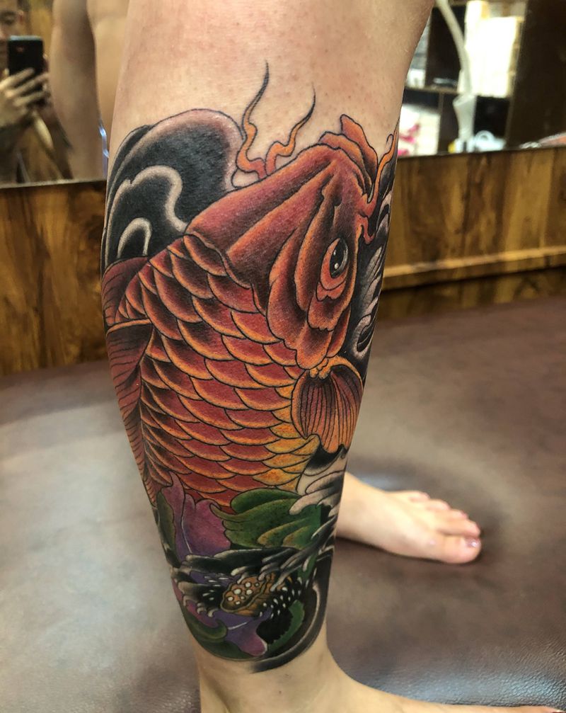 鲤鱼遮盖纹身图片_腿部纹身图案
