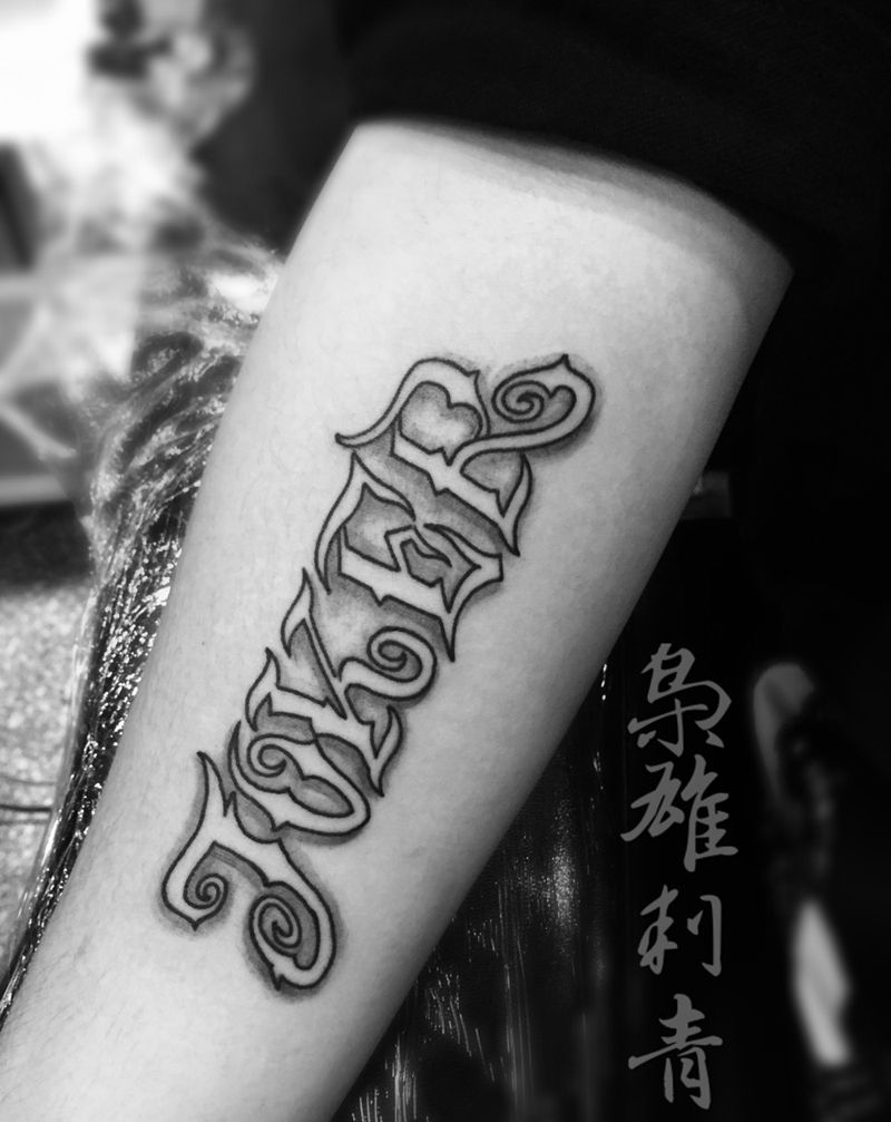 当前位置: 首页 >广东省珠海市纹身店-珠海枭雄纹身馆纹身图案>【字母】纹身图片_成品手臂清新字符纹身图案