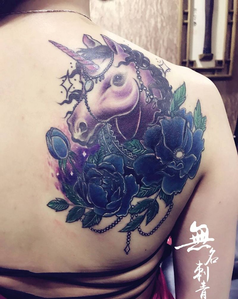 独角兽盖玫瑰纹身图片