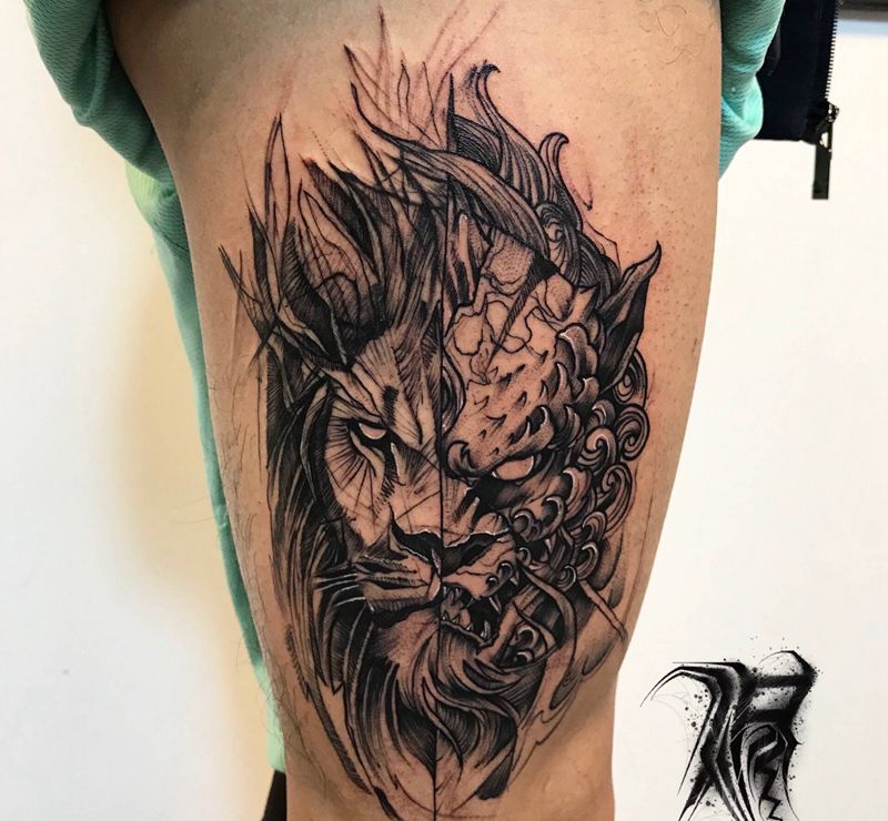 当前位置: 首页 >广东省珠海市纹身店-烬刺青纹身图案>红烧双拼狮头纹身图片_手臂腿部纹身图案