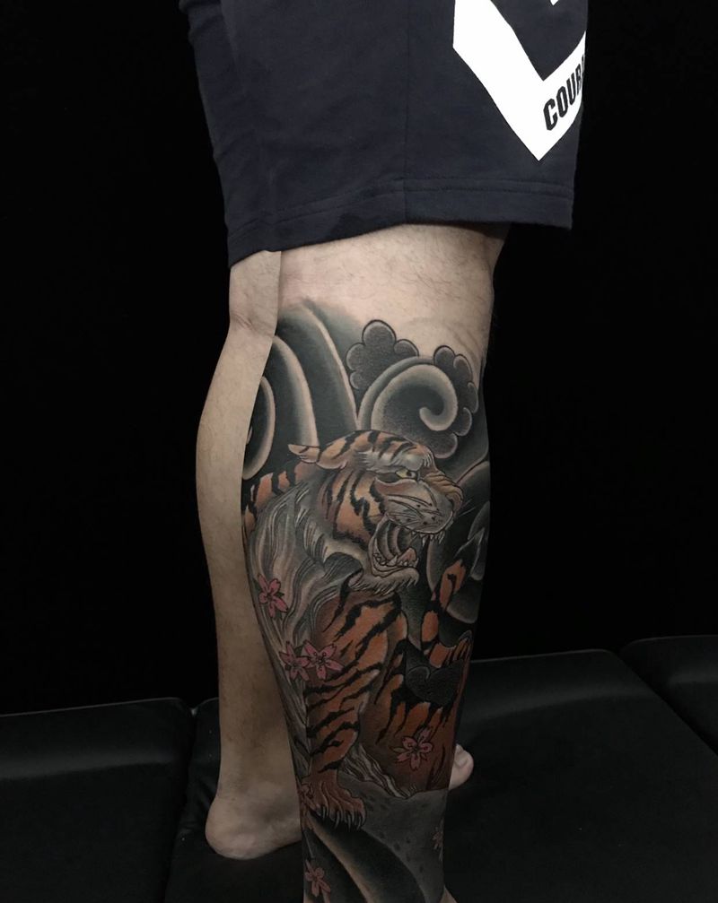 • T网红王老大花腿龙纹身图片_腿部新传统纹身图案