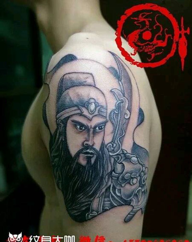 当前位置: 首页 >广东省汕头市纹身店-赤龙纹身工作室纹身图案>关羽关二爷纹身图片_手臂传统人物成品纹身图案