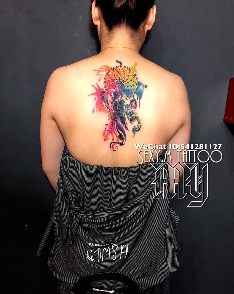 水彩捕梦网风格纹身图片_成品背部欧美清新原创纹身图案