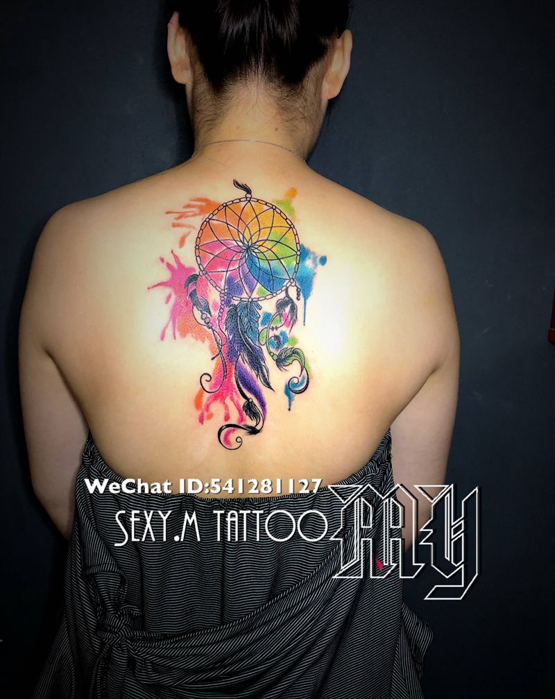 水彩捕梦网风格纹身图片_成品背部欧美清新原创纹身图案