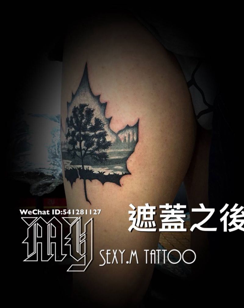 当前位置: 首页 >广东省珠海市纹身店-MY.sexy.m Tattoo纹身图案>黑灰不規則楓葉纹身图片_成品腿部写实纹身图案